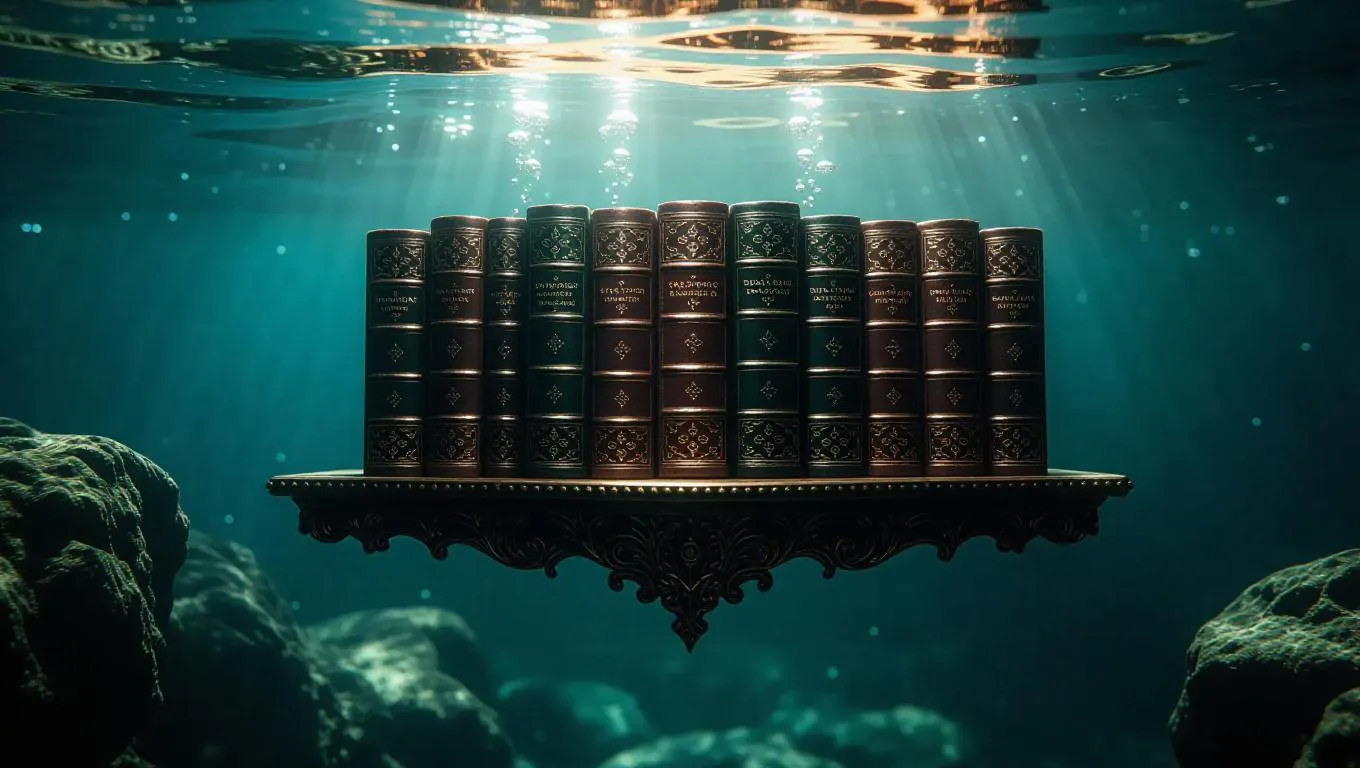 A floating grimoire shelf underwater, ancient and mysterious grimoires opening and closing like ethereal spirits, surrounded by rocky ocean floor and shimmering bubbles, casting an otherworldly glow, creating a mystical and enchanting atmosphere.
