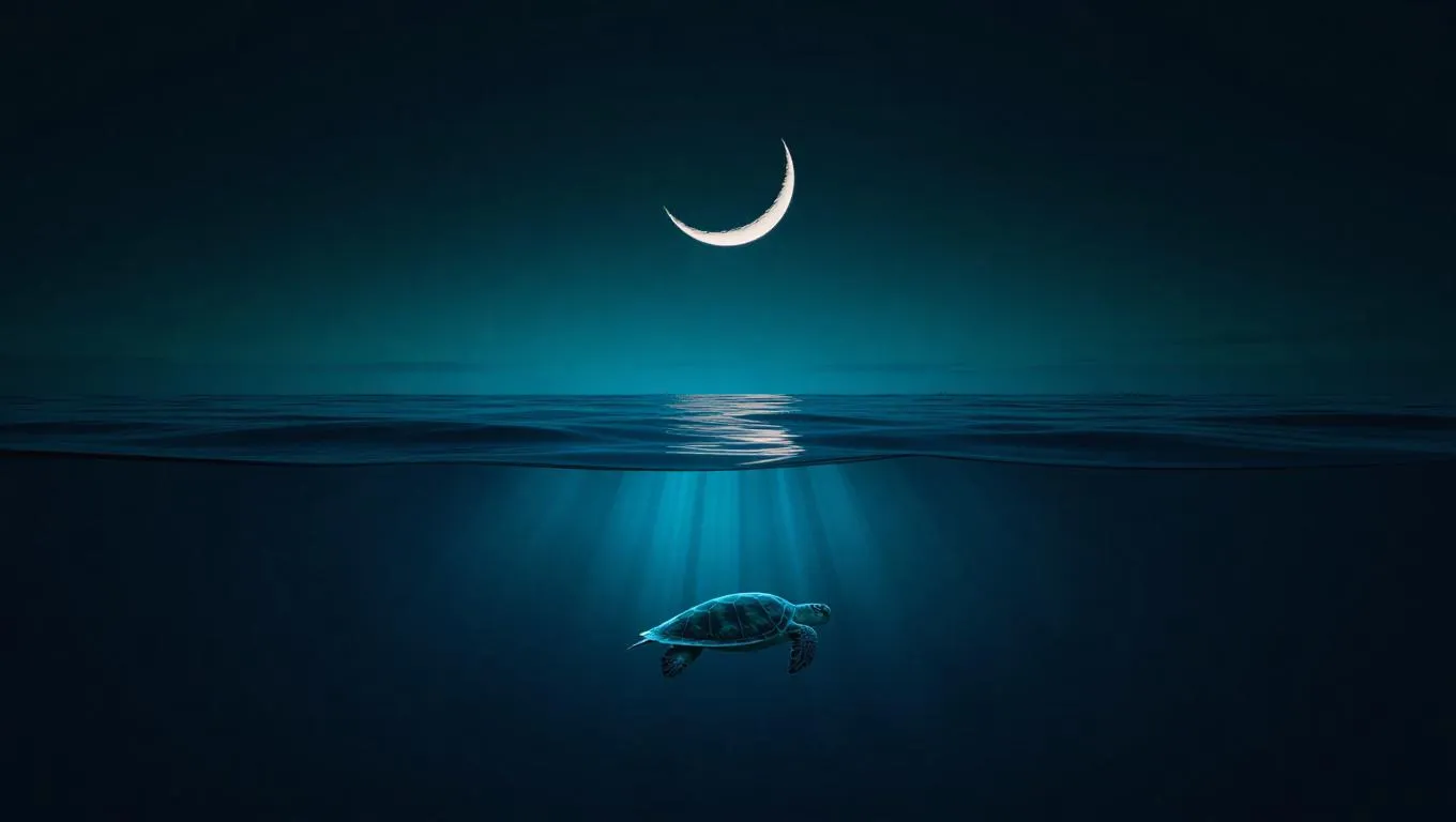 A serene minimal underwater night scene, a slender crescent moon visible through the water's surface, a lone sea turtle passing, creating a tranquil and ethereal atmosphere.