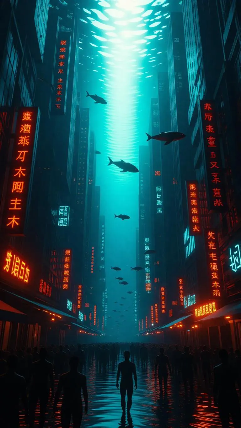 A bustling urban scene underwater, submerged skyscrapers and crowded streets, rays of sunlight filtering through the surface, creating a dynamic play of light and shadow, fiery flames glowing in an underwater furnace, highly detailed, surrounded by busy swimmers, lively atmosphere, bold colors.