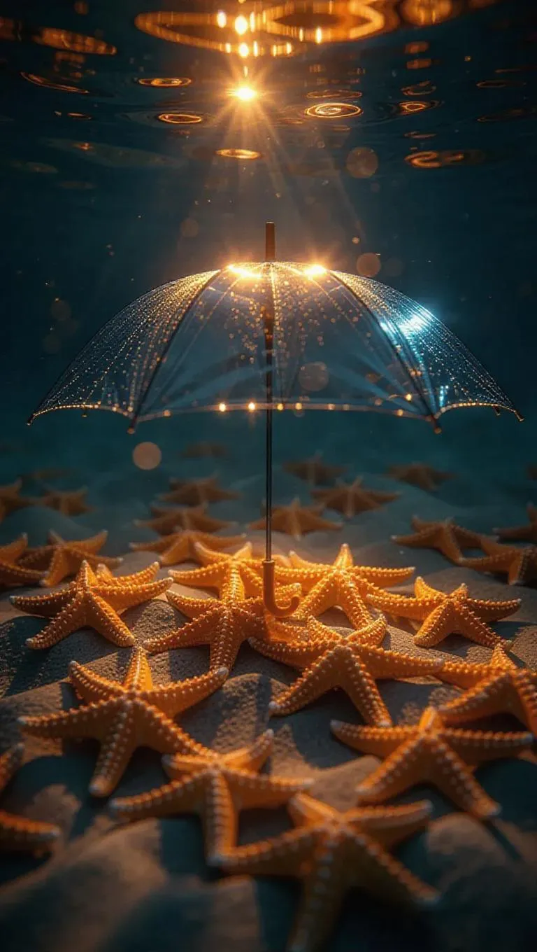A glowing umbrella gently drifting underwater, surrounded by bright starfish scattered on the ocean floor, creating a charming and picturesque mood, with a warm, golden light glinting off their surfaces.