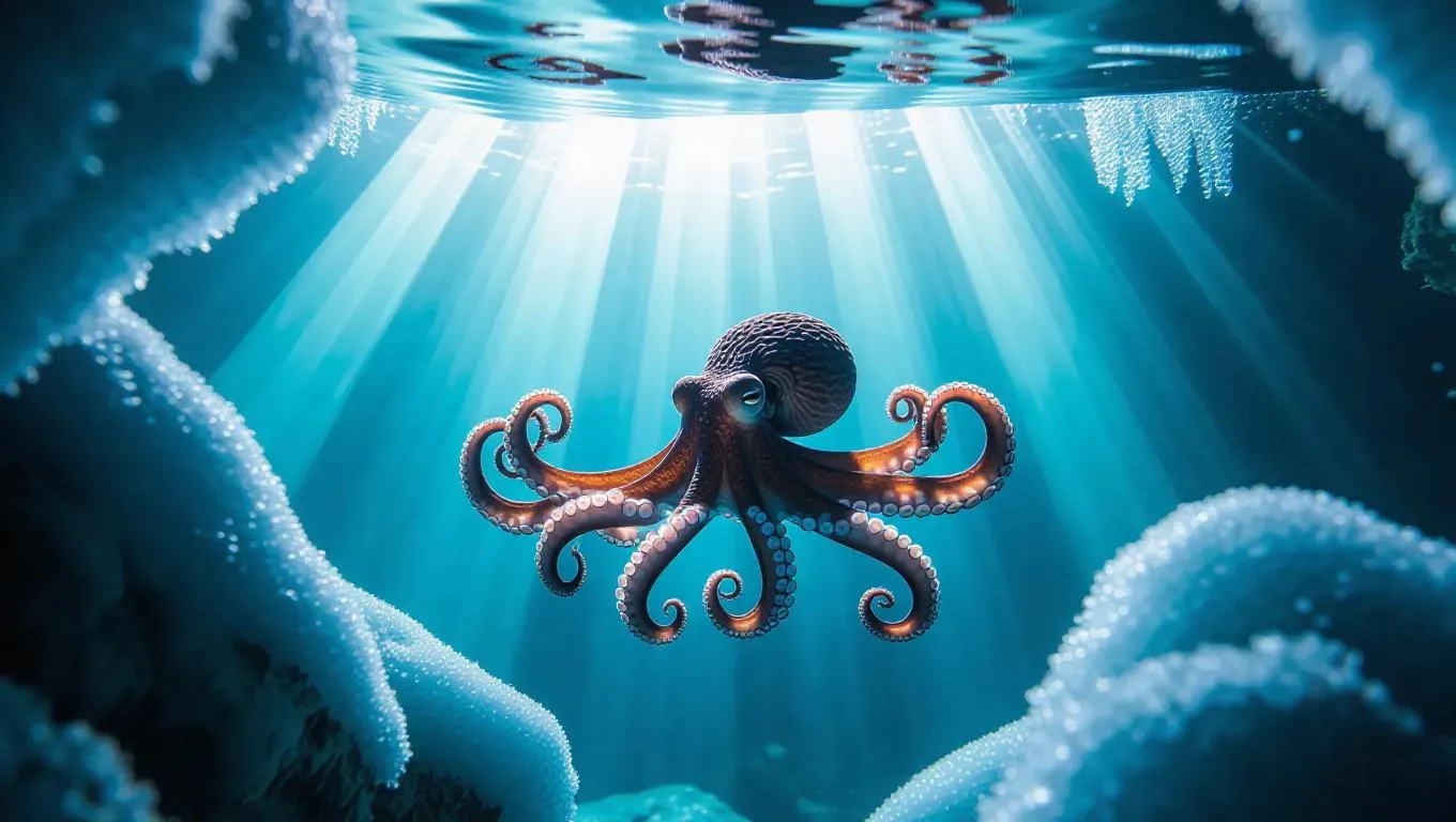 Cinematic shot of a vibrant octopus gliding beneath ice-covered waters, ethereal light beams piercing through jagged cracks above, creating a mesmerizing underwater glow.