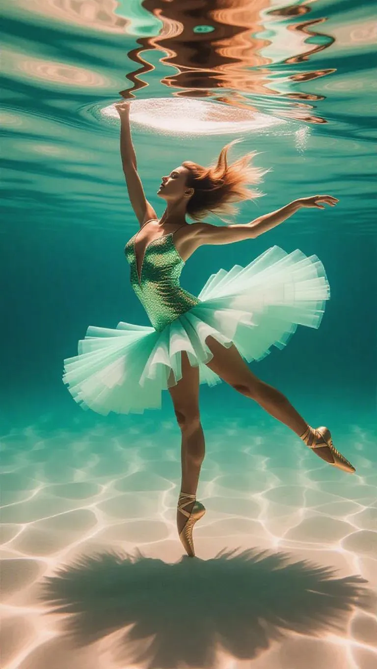 Surreal underwater ballet dancer, composed of shimmering water and radiant light, gracefully gliding through a tranquil, emerald sea, surrounded by golden sands, creating a mesmerizing dance of colors and motion.
