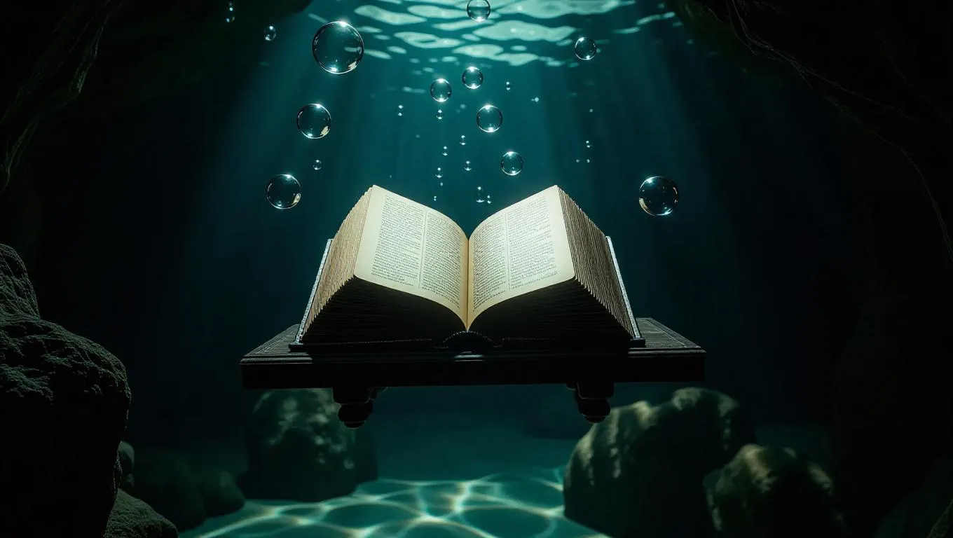 A floating grimoire shelf underwater, ancient and mysterious grimoires opening and closing like ethereal spirits, surrounded by underwater caves and shimmering bubbles, casting an otherworldly glow, creating a mystical and enchanting atmosphere.