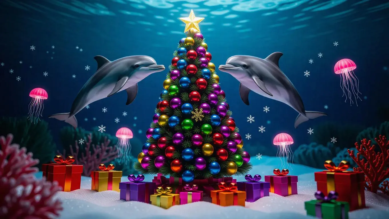 A festive underwater holiday celebration, dolphins adorning a colorful coral Christmas tree, octopuses exchanging seaweed gifts, jellyfish illuminating the scene with bioluminescent glow, snowflakes of bubbles drifting down, creating a magical and enchanting atmosphere.