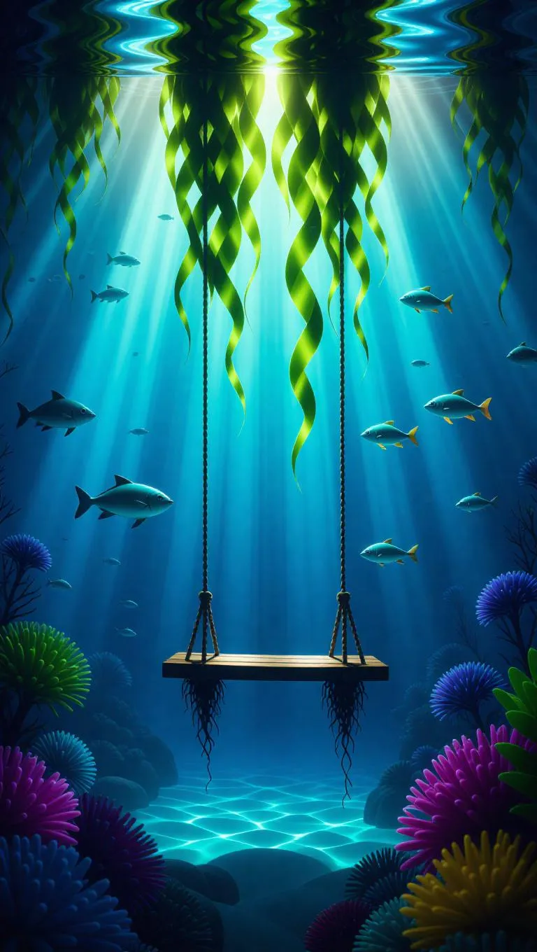 Soft-focused fantasy scene, an underwater swing hanging from a giant kelp stalk, glowing plankton floating in the water, ethereal light beams piercing through the surface, creating a magical ambiance, vibrant marine life swimming around.