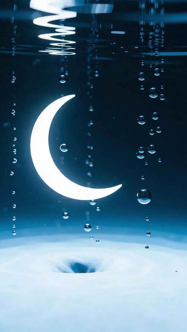 A serene minimal underwater night scene, a slender crescent moon visible through the water's surface, bubbles rising slowly, creating a tranquil and ethereal atmosphere.