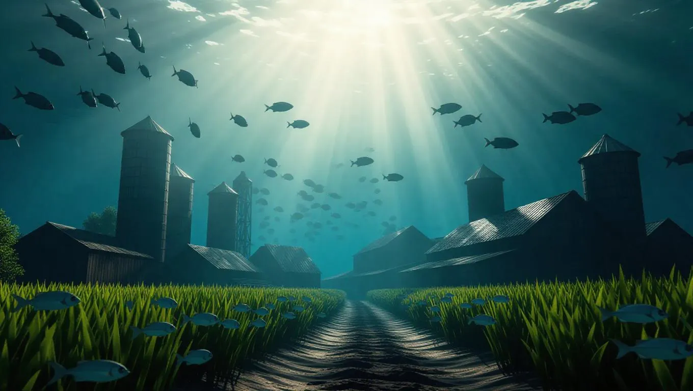 A surreal farmyard scene underwater, with submerged silos and fields, rays of sunlight piercing through the water, creating a rustic play of light and shadow, cinematic lighting, highly detailed, surrounded by swirling schools of exotic fish, evoking a dreamlike atmosphere.