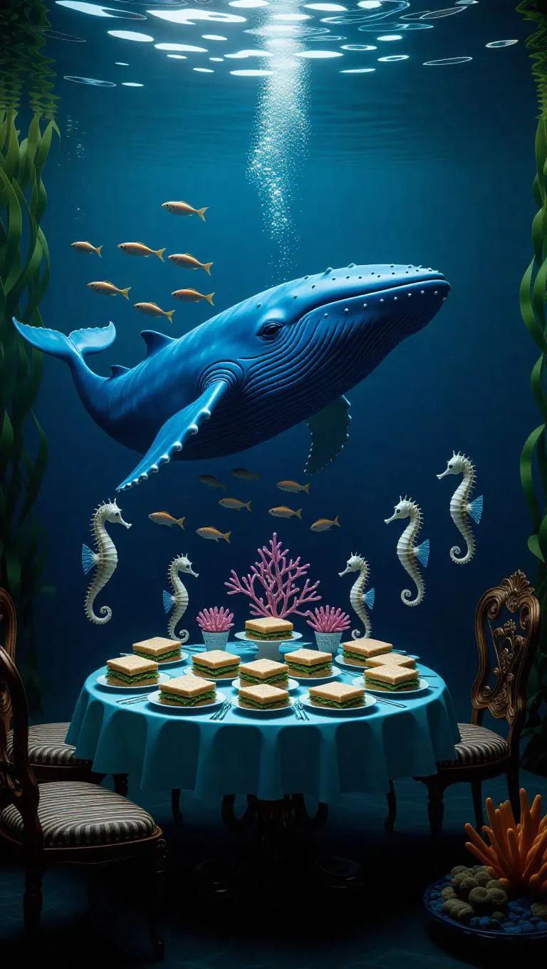 A whimsical underwater picnic scene where a blue whale swims by a small, ornate table covered with seaweed sandwiches and coral cakes. A school of tiny fish swims by, intrigued by the unusual setup, while elegant seahorses serve as attentive waiters.