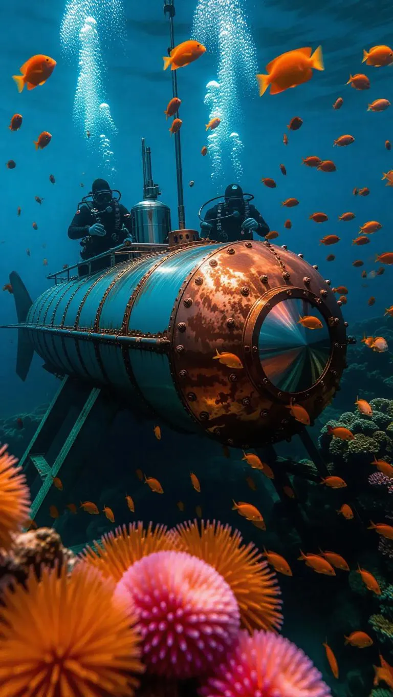 A crew of experienced underwater builders constructs a cutting-edge submarine research station on the ocean floor, meticulously welding metal beams and installing modern technology. Colorful fish and curious anemones hover nearby, observing their progress in the vibrant marine environment.