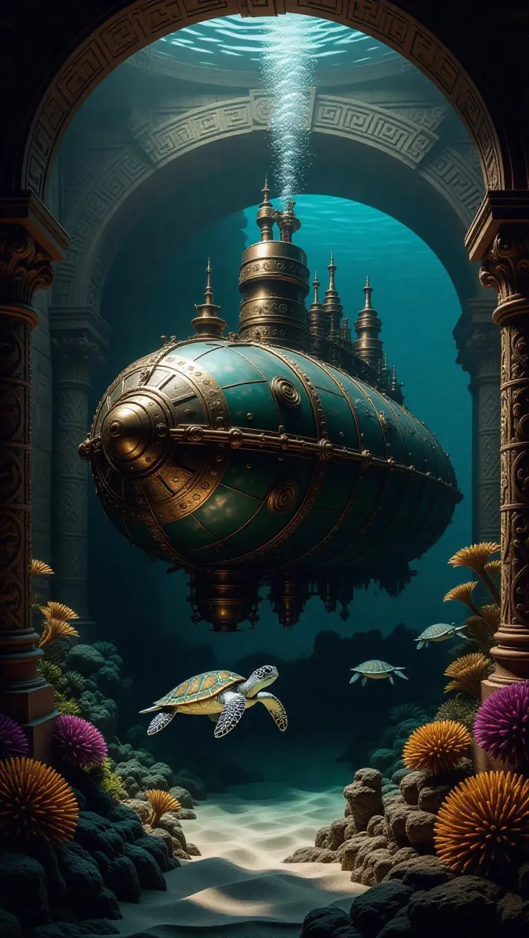 Dutch angle shot of a Victorian submarine darting through ancient Mayan ruins, brass gears rotating amidst coral reefs, air bubbles rising from bronze fittings, oil-painting style with grainy texture, surreal underwater lighting, elaborate mechanical details, exotic sea turtles.