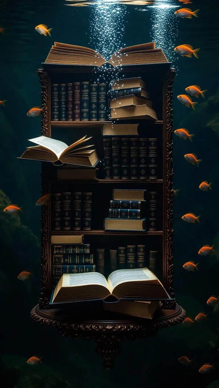A floating grimoire shelf underwater, ancient and mysterious grimoires opening and closing like ethereal spirits, surrounded by bioluminescent fish and shimmering bubbles, casting an otherworldly glow, creating a mystical and enchanting atmosphere.