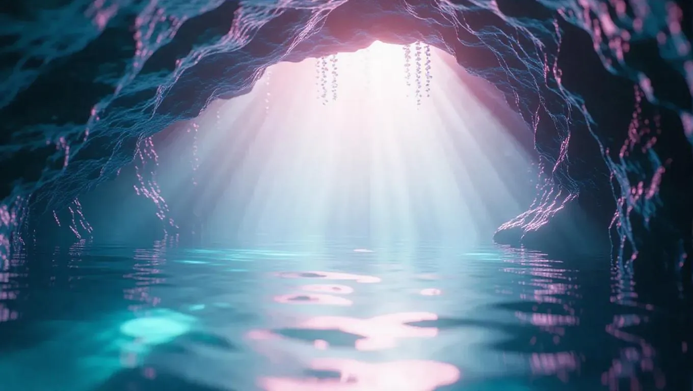 18. Soft-focus dreamy underwater scene of a mysterious underwater cave, pastel colors, gentle ripples, ethereal light beams, and a serene, tranquil atmosphere.