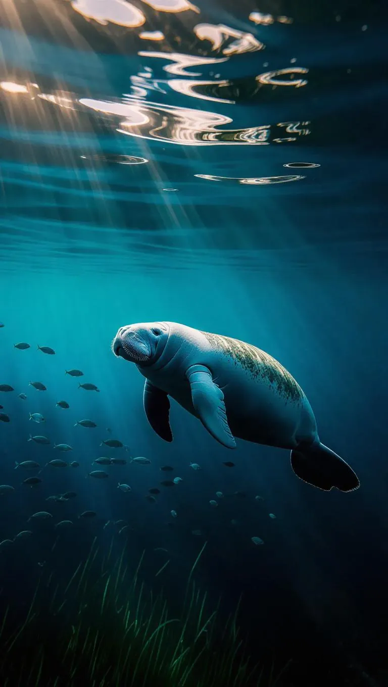 6. Underwater scene, a single manatee slowly centered in deep azure waters, surrounded by a school of tiny fish, soft gradients transitioning from dark to light, clean and elegant lines, ethereal glow, gentle currents, sea grass in the background, sunlight filtering through the surface.