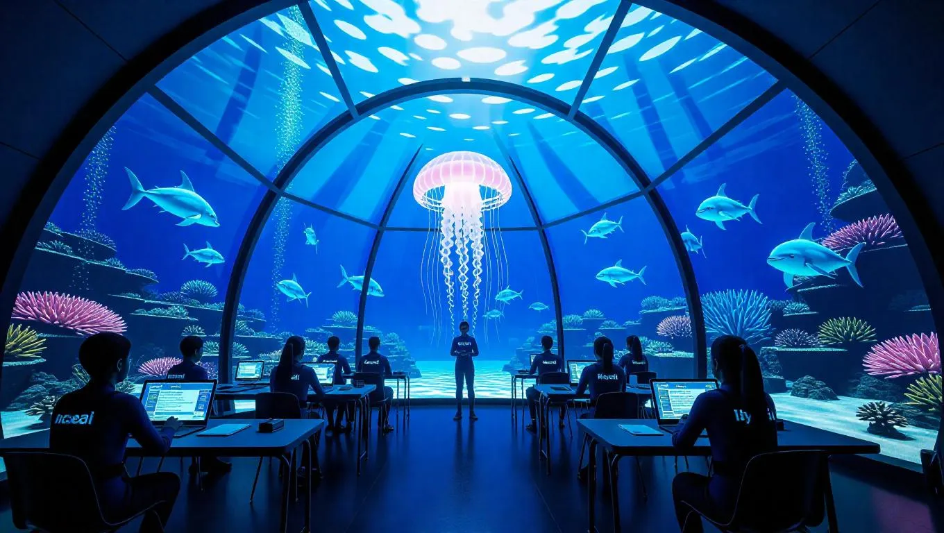 Futuristic underwater dome classroom, holographic screens vividly projecting language learning, AI jellyfish tutors glowing softly with vocabulary, students wearing breathable diving suits actively taking notes, surrounded by playful dolphins and coral gardens.
