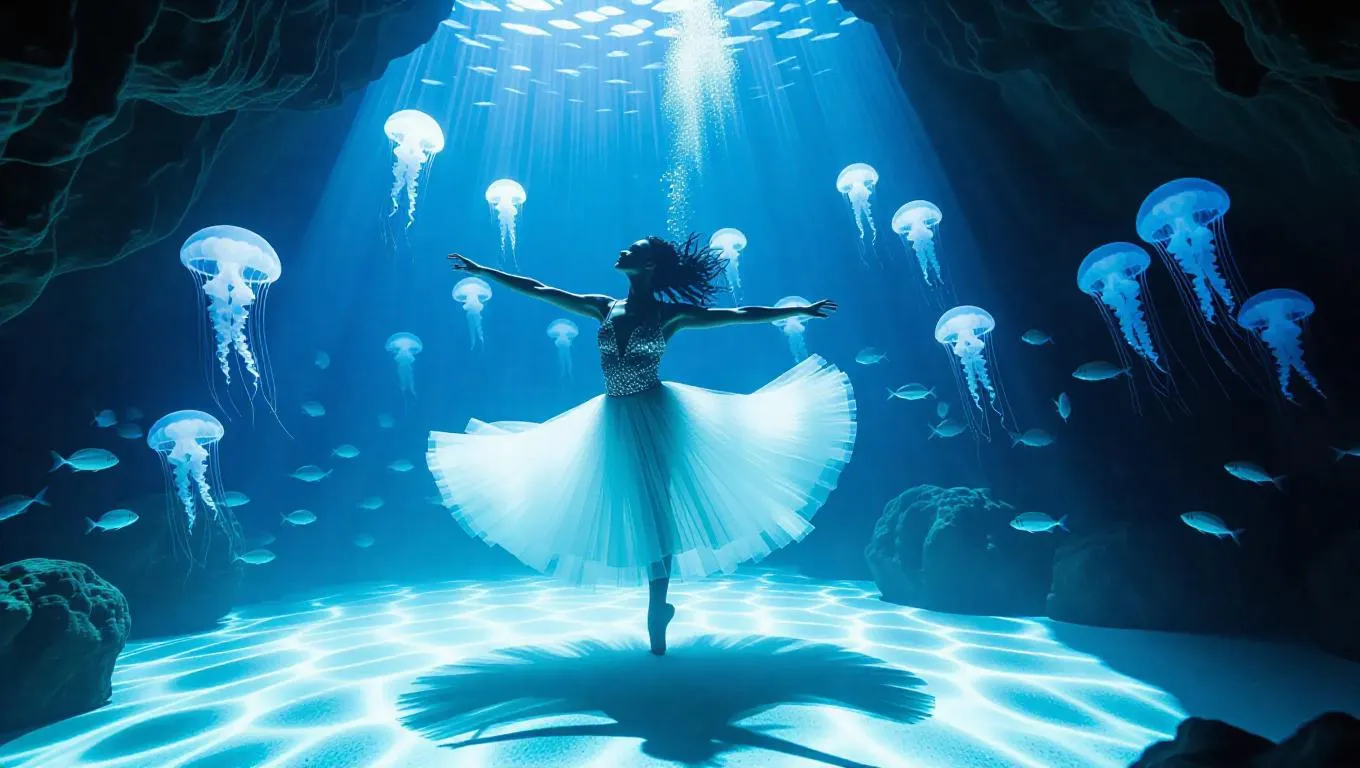An underwater dancer performs a mesmerizing routine in a painted cave, their whimsical movements synchronized with the darting fish. Jellyfish emit soft, bioluminescent glows in the background, enhancing the enchanting and magical atmosphere.