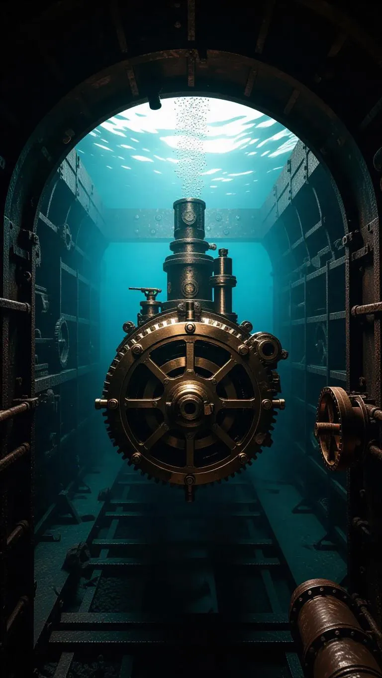 Dutch angle shot of a Victorian submarine searching for forgotten ruins, brass gears rotating amidst broken relics, air bubbles rising from rusted frames, oil-painting style with nostalgic feel, soft underwater lighting, delicate mechanical features, cautious sea slugs.