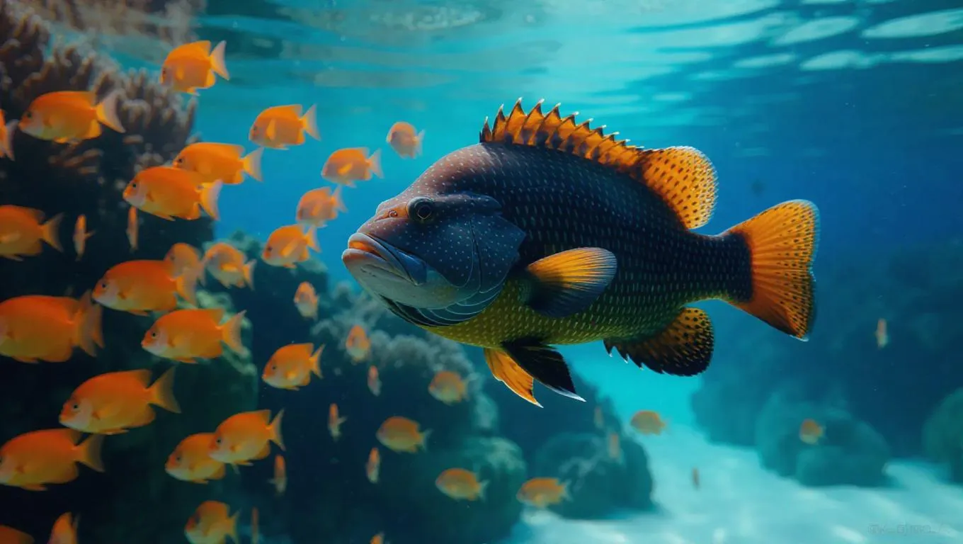 14. Underwater scene, a single grouper confidently centered in deep dark blue waters, surrounded by a school of bright fish, soft gradients transitioning from dark to light, clean and elegant lines, ethereal glow, gentle currents, underwater gardens in the background, sunlight filtering through the surface.
