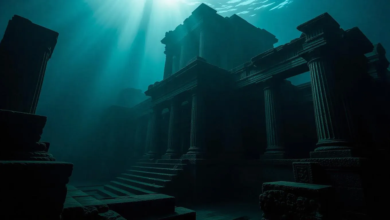 A daunting underwater ruins of an ancient civilization, with crumbling stone structures covered in barnacles and fire, illuminated by shafts of sunlight filtering through murky waters, creating an eerie and captivating atmosphere.