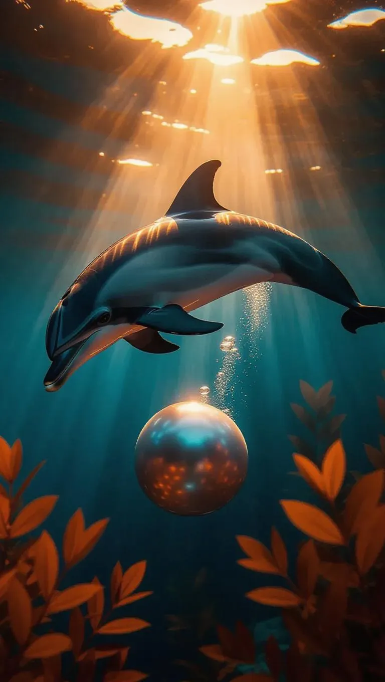 Cinematic close-up of a dolphin's fin gracefully gliding over a luminous pearl, dramatic shadows cast by ethereal orange light, bubbles swirling around, vibrant underwater plants adding depth and texture.
