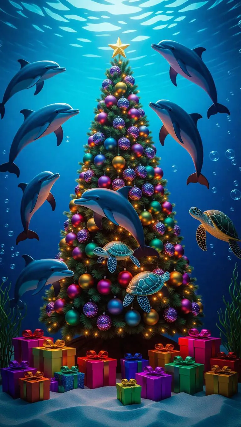 A festive underwater holiday celebration, dolphins adorning a vibrant coral Christmas tree, turtles exchanging seaweed gifts, jellyfish illuminating the scene with a soft bioluminescent glow, bubbles dancing around, creating a magical and enchanting atmosphere.