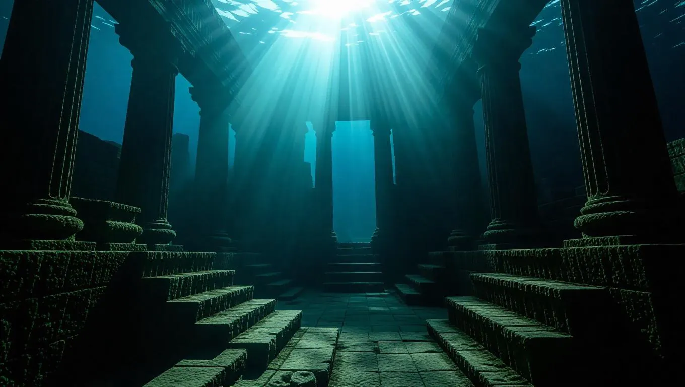 A mysterious underwater ruins of an ancient city, with crumbling stone structures covered in coral and seaweed, illuminated by shafts of sunlight piercing the depths, creating an eerie and captivating atmosphere.