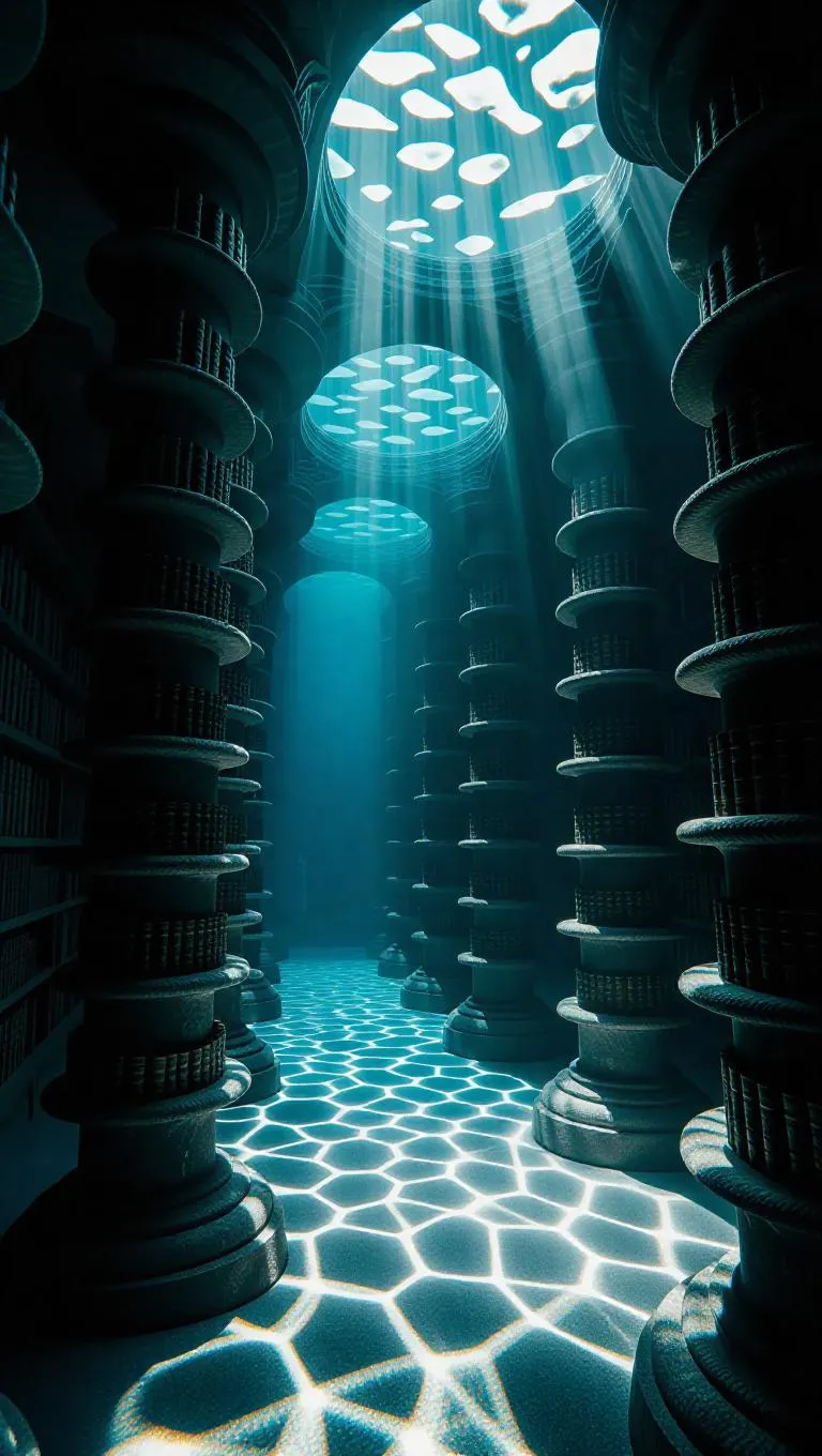 A grand underwater library with spiraled columns crafted from seashells, where ancient scrolls flutter in the tranquil sea. Dappled light streams from above, creating intricate designs on curious merfolk scholars.
