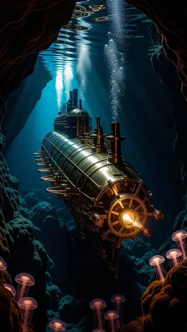Dutch angle shot of a Victorian submarine navigating through glittering underwater caves, brass gears rotating amidst mineral deposits, air bubbles rising from platinum rivets, oil-painting style with sparkling effect, radiant underwater lighting, captivating mechanical features, luminescent jellyfish.