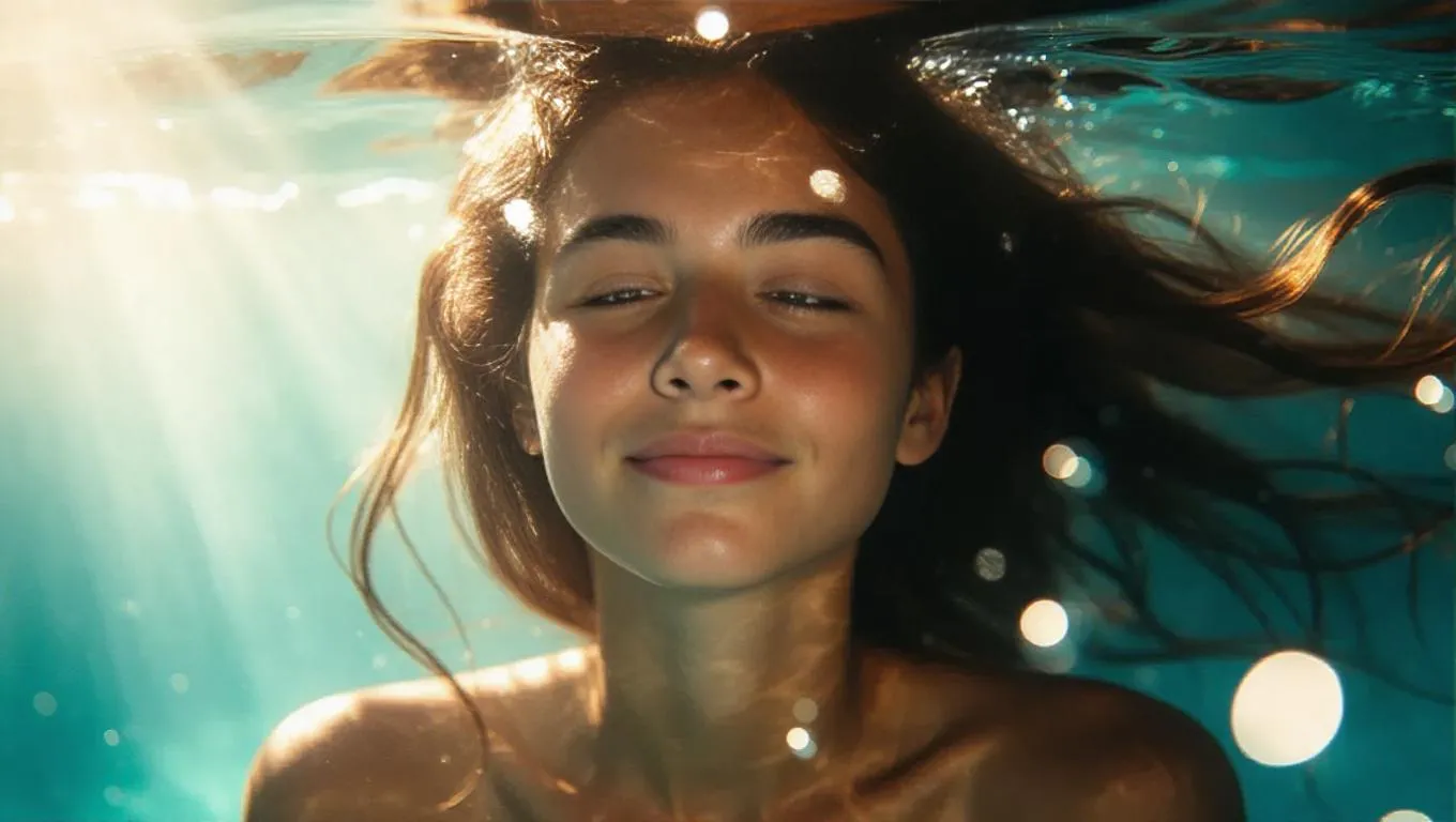 Cinematic underwater portrait of a girl with flowing hair, bright light beams radiating through the depths, happy and carefree expression, soft bokeh effect, surrounded by playful currents and glistening bubbles.