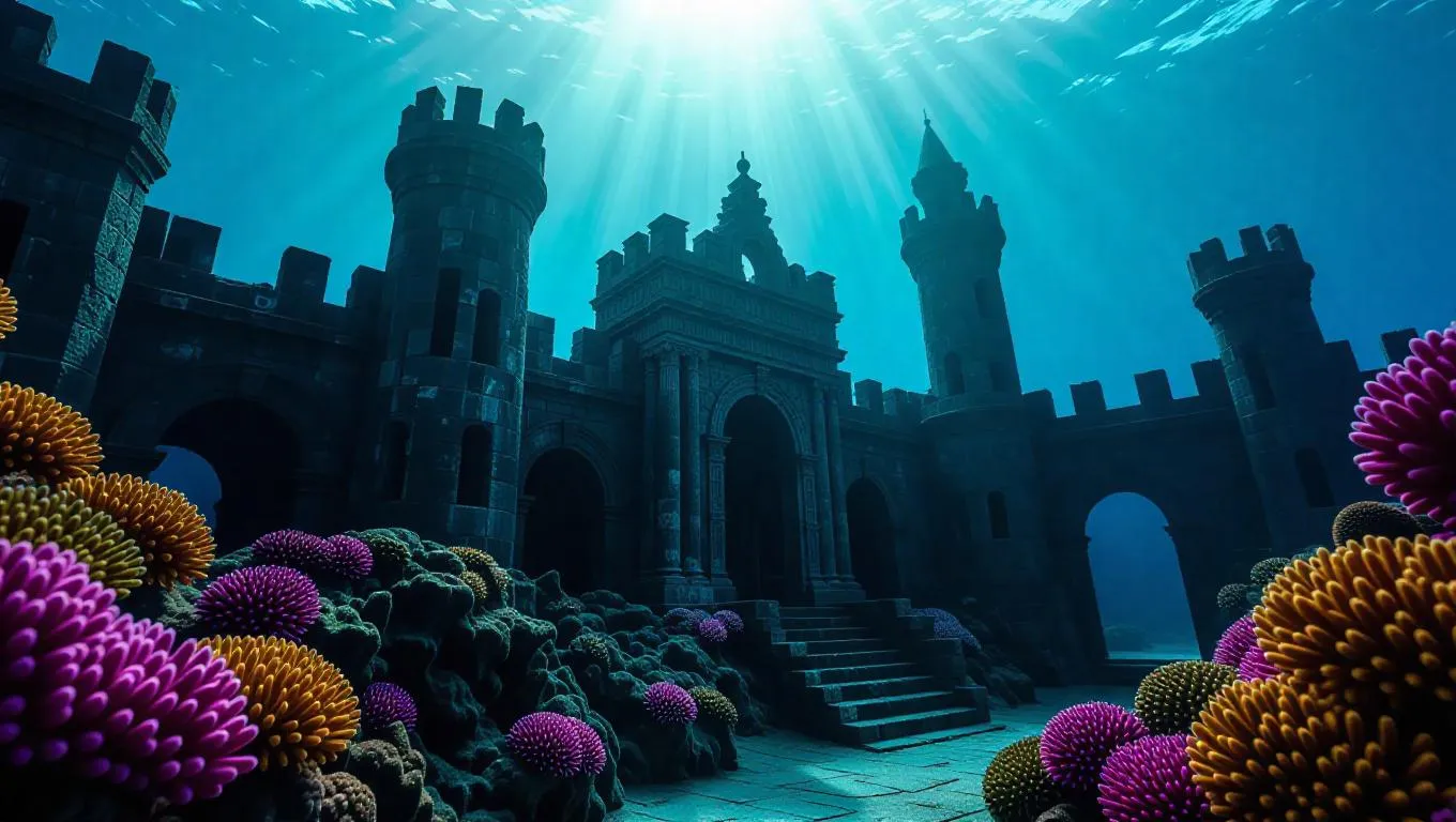 A mysterious underwater ruins of a lost kingdom, with crumbling stone fortifications dressed in colorful coral and fire, illuminated by shafts of sunlight spilling through the blue depths, creating an eerie and captivating atmosphere.