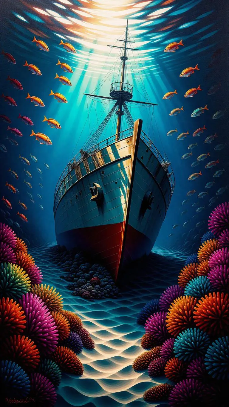 Oil painting of a shipwreck split in two, illuminated by colorful reef fish, rich textures, dramatic shadows, and swirling underwater currents, creating a hauntingly beautiful scene.