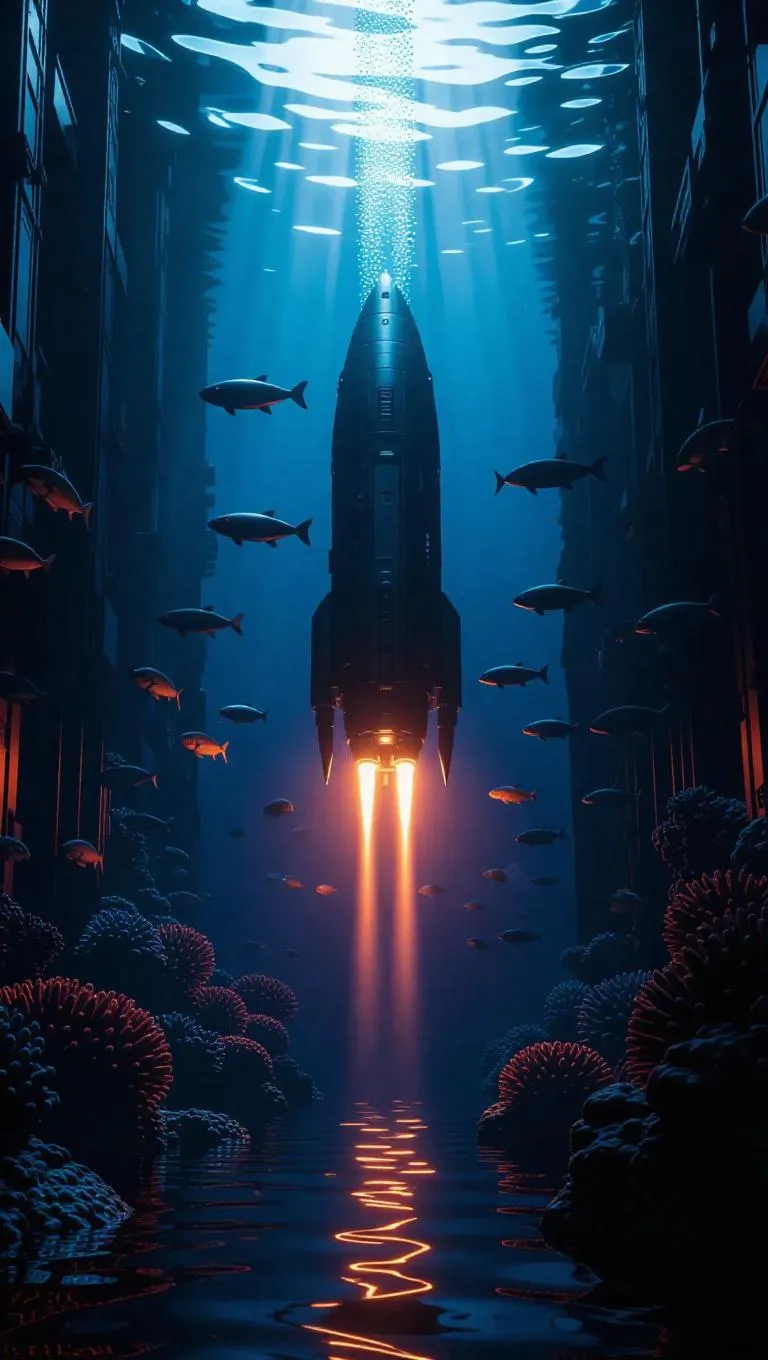 A futuristic human life scene underwater, showcasing submerged defense systems and security drones, flames trailing behind as if from jet propulsion, rays of sunlight piercing through the water, creating a protective play of light and shadow, cinematic lighting, highly detailed, surrounded by swirling schools of vigilant fish, vibrant coral reefs, and sleek, modern architecture.