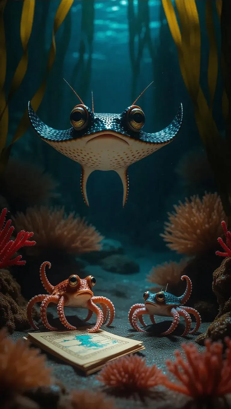 A mysterious underwater detective scene, a cunning stingray investigates a missing pearl case, interrogating a guilty octopus and a trembling crab. Clues like broken shells and a frayed map are scattered among vibrant coral and twirling seaweed, creating a suspenseful and intriguing atmosphere.