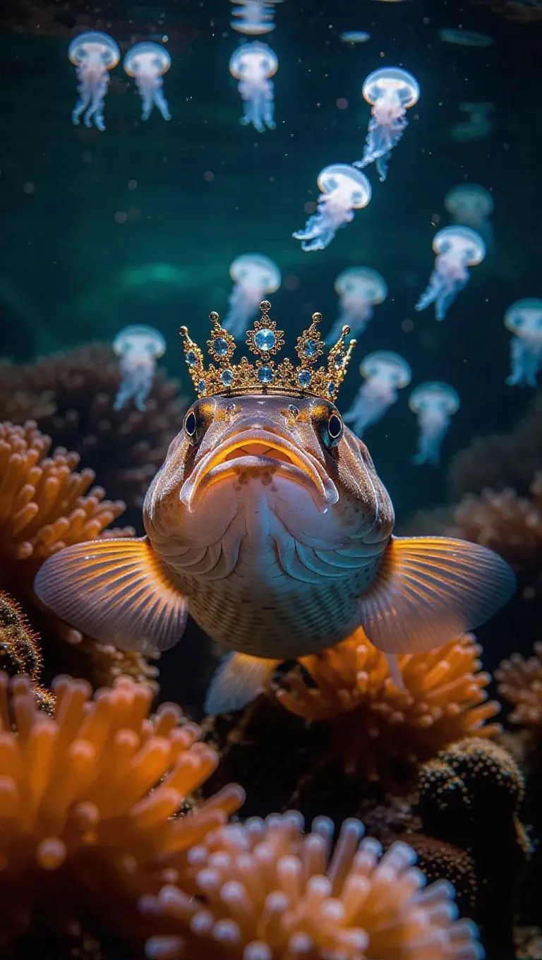 A mystical catfish wearing a radiant crown, lounging majestically on a bed of vibrant coral, encircled by a swarm of tiny, bioluminescent jellyfish, set in a whimsical underwater fantasy landscape, with crystal-clear water and enchanting glow.