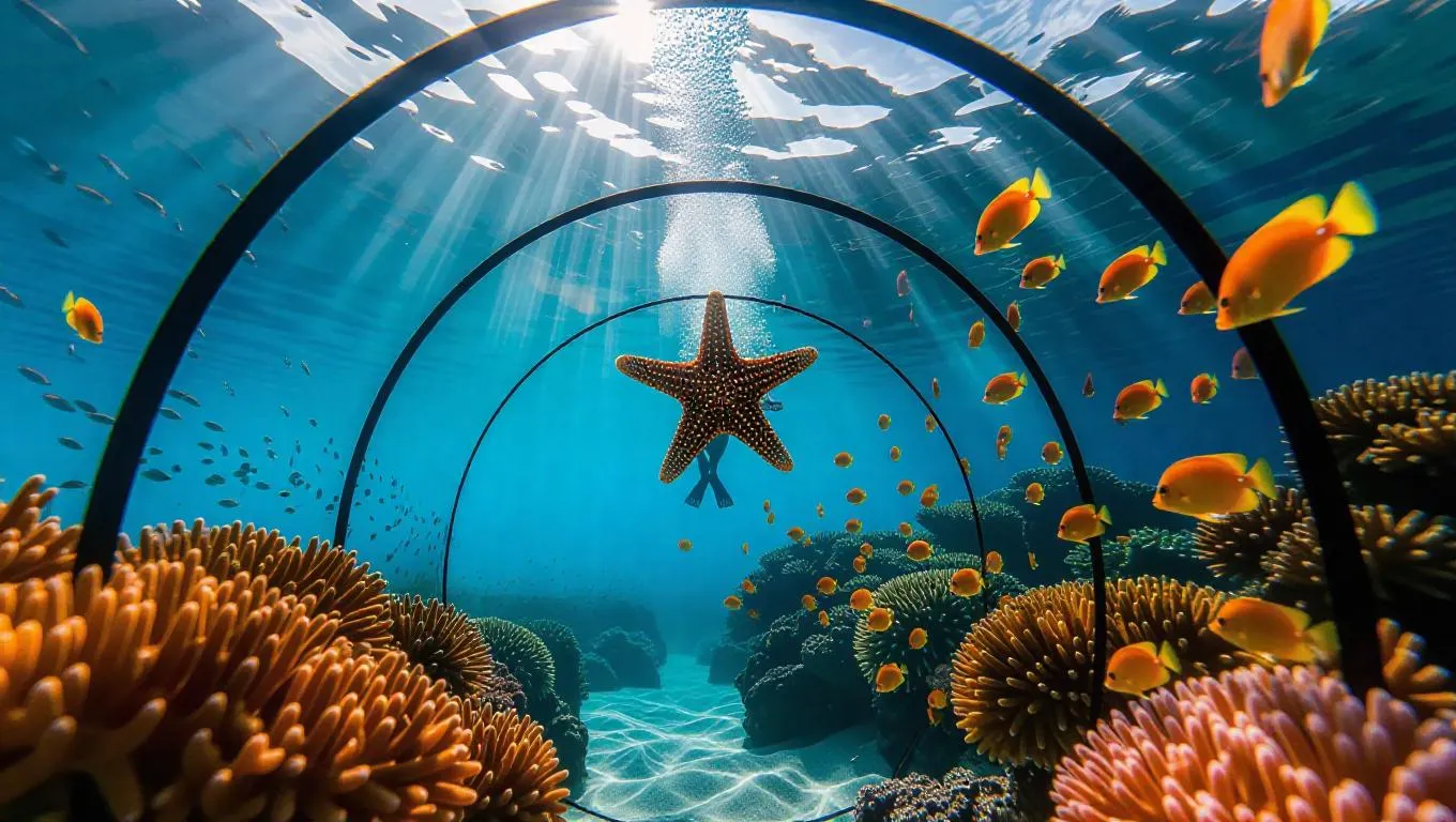Top-down view of snorkeler sharing a moment with a sea star near colorful coral reefs, schools of angel fish shimmering in the light, sunlight breaking through a clear glass viewing tunnel, creating a surreal underwater spectacle.