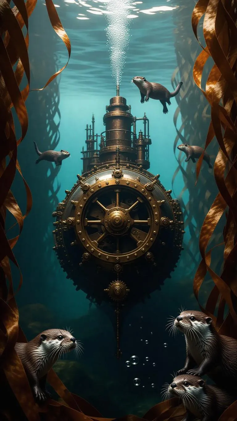 Dutch angle shot of a Victorian submarine navigating through kelp-covered shipwrecks, brass gears rotating in the weeds, air bubbles rising from steel rivets, oil-painting style with rich hues, soft underwater lighting, whimsical mechanical patterns, playful otters.