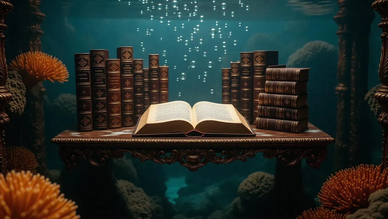 A floating grimoire shelf underwater, weathered and ornate grimoires opening and closing like ethereal spirits, surrounded by a coral garden and shimmering bubbles, casting an otherworldly glow, creating a mystical and enchanting atmosphere.