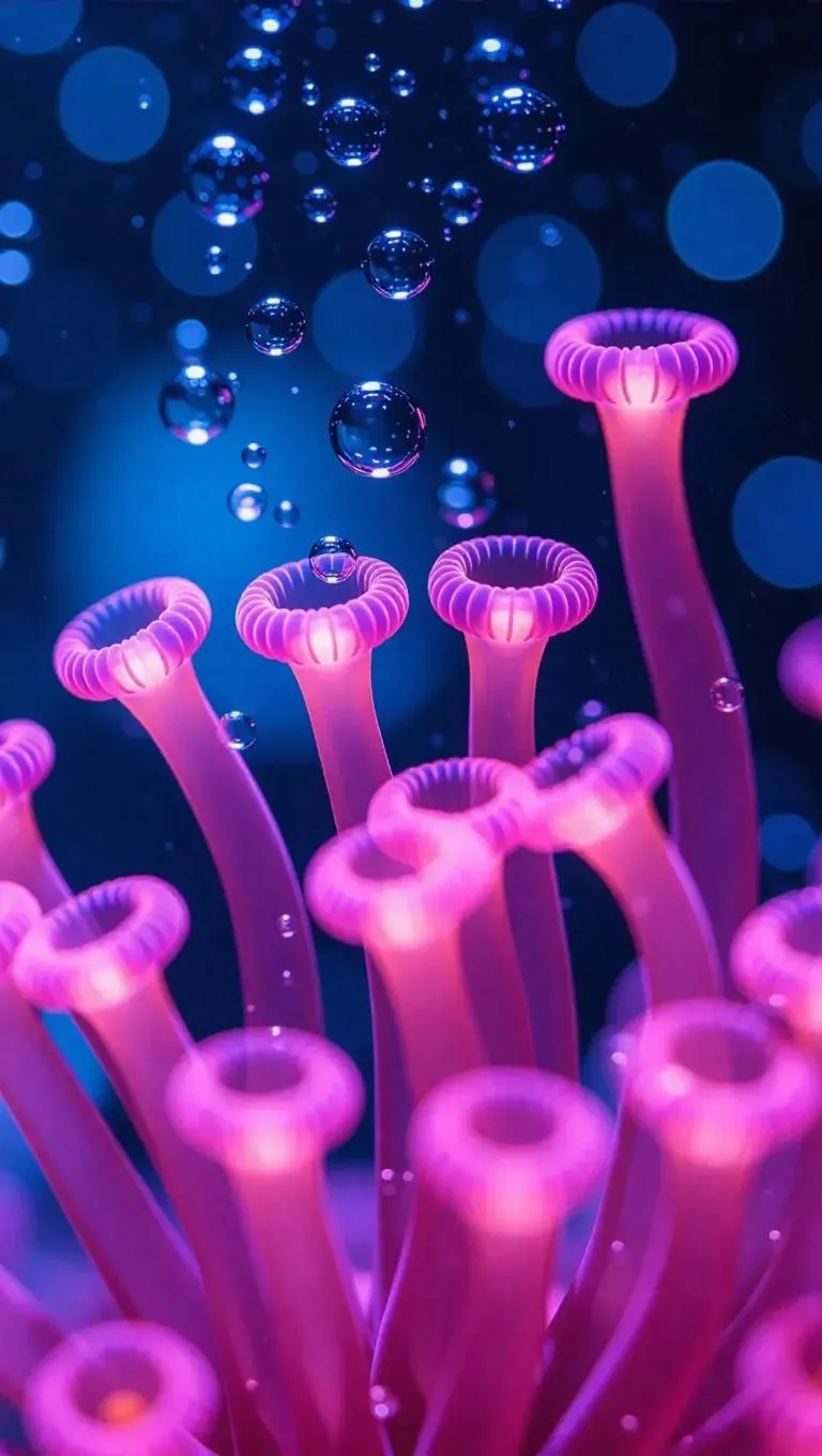 Macro shot of vibrant anemone tentacles swaying in the current, surrounded by bubbles of nitrogen and a soft, glowing underwater ambiance.