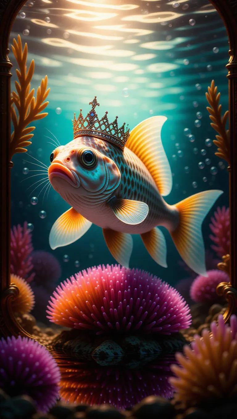 An elegant mystical catfish adorned with a sparkling tiara, nestled upon a colorful coral base, surrounded by tiny, bioluminescent plankton, framed within a fantastical underwater realm, with rippling water and celestial light.