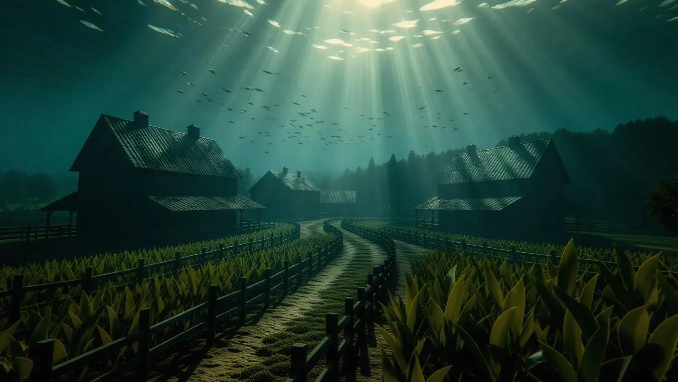 A surreal farmyard scene underwater, with submerged barns and fields, beams of sunlight cutting through the water, creating an ethereal play of light and shadow, cinematic lighting, highly detailed, surrounded by swirling schools of gentle fish, evoking a dreamlike atmosphere.