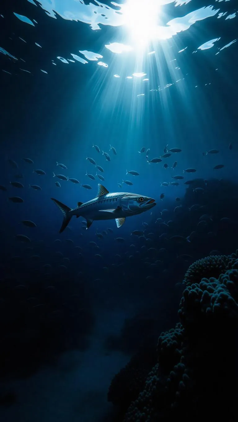 17. Underwater scene, a single barracuda stealthily centered in deep navy blue waters, surrounded by a school of small fish, soft gradients transitioning from dark to light, clean and elegant lines, ethereal glow, gentle currents, underwater mountains in the background, sunlight filtering through the surface.