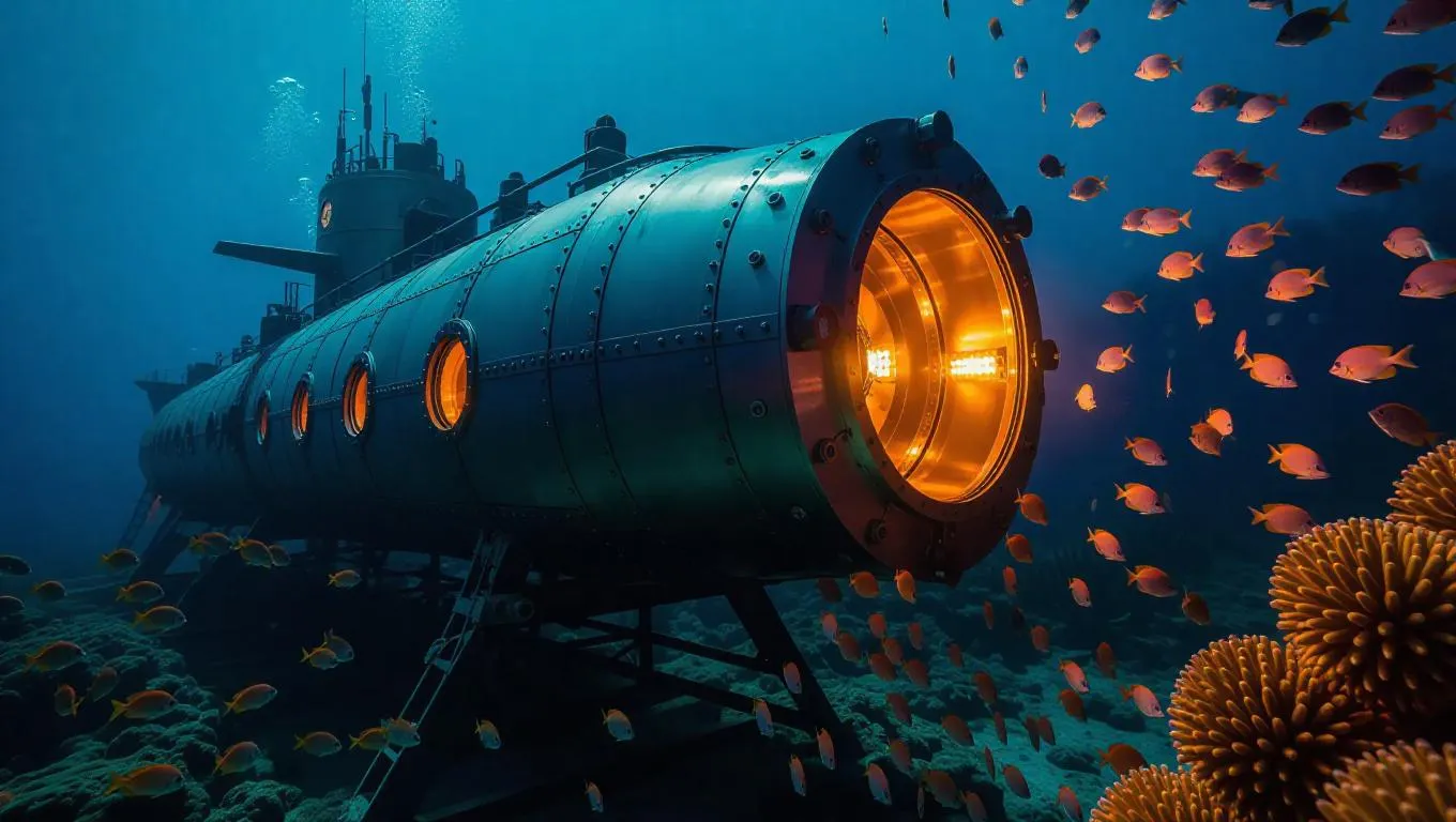 A team of innovative underwater scientists constructs a state-of-the-art submarine research station on the ocean floor, meticulously welding metal beams and installing high-tech devices. Colorful fish and inquisitive seahorses hover nearby, observing their progress in the vibrant marine environment.