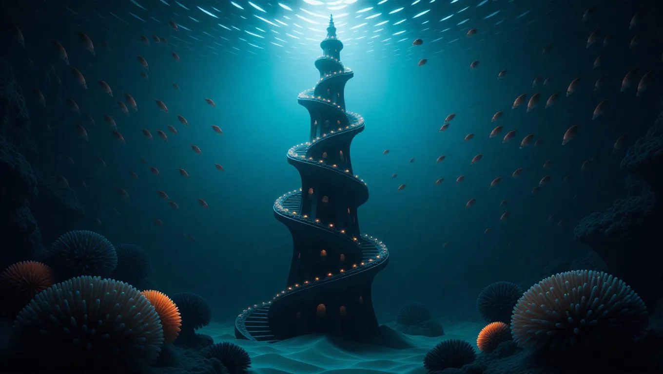 A peculiar underwater tower spiraling upward, touched by soothing surface light, flowing lines, dreamlike atmosphere, surrounded by gentle currents and ethereal water, with bioluminescent fish and flaming corals adding a magical glow.