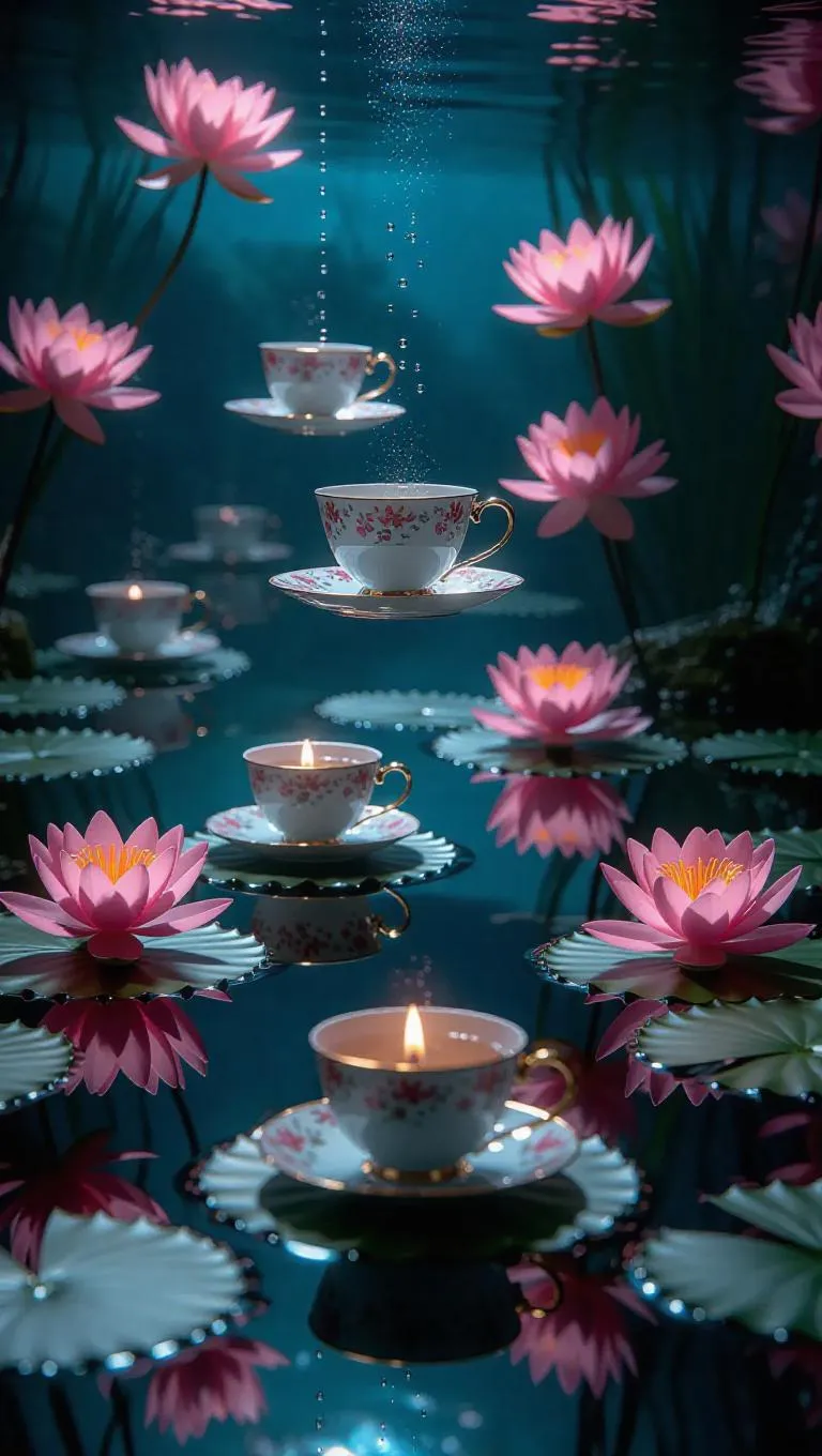 Surreal underwater tea party, floating teacups and lily pads, dreamlike colors, weightless atmosphere, delicate bubbles, soft ambient lights, ocean floor backdrop, serene and whimsical.