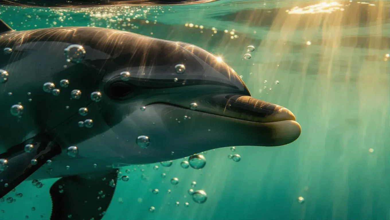 Cinematic close-up of a dolphin's snout gliding over a vibrant jade, dramatic shadows cast by ethereal olive light, bubbles swirling around, vibrant underwater scenes adding depth and texture.