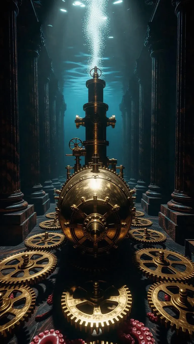 Dutch angle shot of a Victorian submarine analyzing ancient Roman artifacts, brass gears rotating amidst marble columns, air bubbles rising from brass locks, oil-painting style with classical touch, ancient underwater lighting, historically intricate mechanicals, curious octopuses.