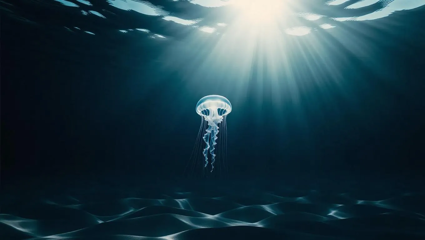 Minimalist underwater scene, a single jellyfish gracefully centered in clear ocean waters, soft gradients transitioning from dark to light, clean and elegant lines, ethereal glow.