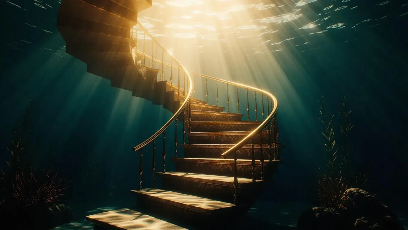 A fantastical underwater staircase spiraling upward, bathed in soft golden light, angular lines, magical atmosphere, surrounded by calm currents and sparkling water.