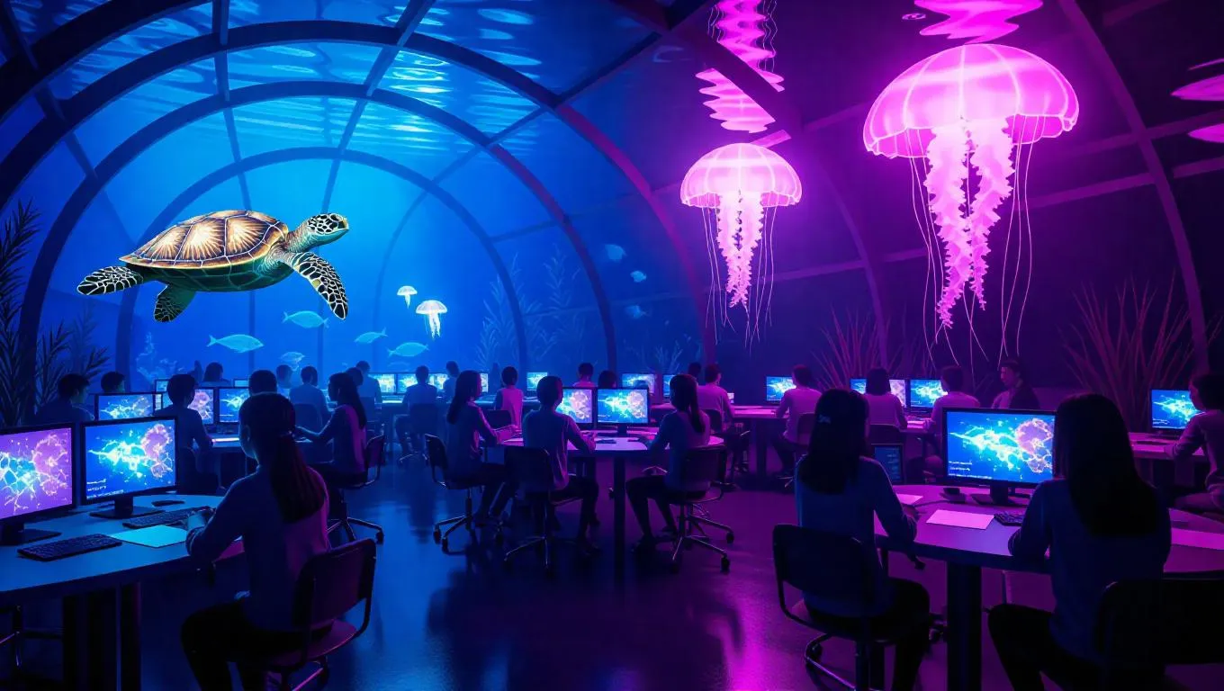 Futuristic underwater dome classroom, holographic screens vividly projecting poetry rules, AI jellyfish tutors glowing softly with creative prompts, students wearing colorful rebreathers enthusiastically taking notes, surrounded by radiant sea turtles and kelp forests.