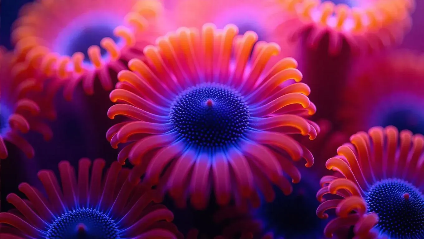 Macro shot of vibrant anemone tentacles swaying in the current, surrounded by traces of ocean currents and a soft, glowing underwater ambiance.