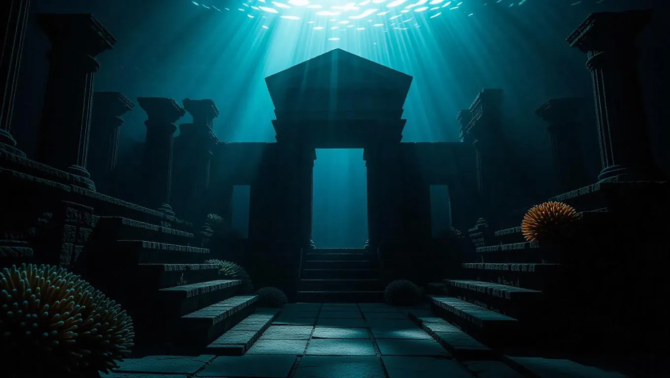 A mysterious underwater ruins of an ancient city, with crumbling stone structures covered in coral and fire, illuminated by shafts of sunlight piercing the depths, creating an eerie and captivating atmosphere.
